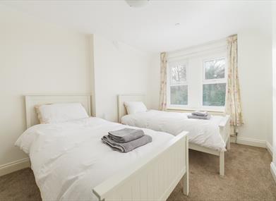 Bedroom 2: Twin beds, bedside table, chest of drawers, wardrobe