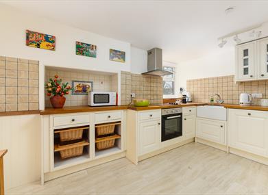 Kitchen/Dining area: Oven, hob, fridge, freezer, dishwasher, microwave, dining table & two benches