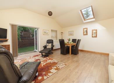 Lounge: Log burner, sofa bed, two recliners, dining table with four chairs, TV