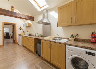Kitchen: Oven, hob, fridge, freezer, microwave, washing machine, kettle and toaster.