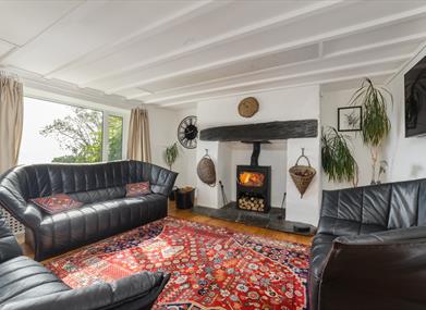 Living room: Comfortable sofa seating for 6 guests, TV, log burner, extensive library of reading material.