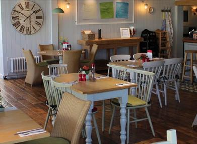 Horse & Plough pub is a transformation of the conservatory into a light-filled dining space that brings a touch of beach house-chic to Braddan, where cool neutral tones are offset by creative flourishes including over-sized post-it notes and an homage to that staple of British cooking, OXO, as artwork, while shelves in one corner display Manx products - from preserves to flour - as decorative items.