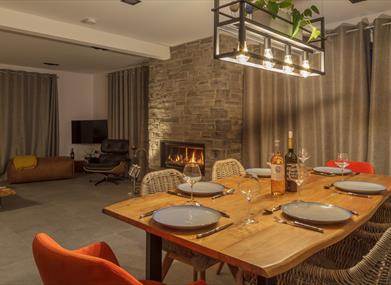 Lounge: Gazco gas powered fire, sofa and comfortable seating, Smart TV, Zain bluetooth speaker system, coffee table.