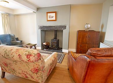 Snug: One sofa, two armchairs in the lounge area featuring log burner.