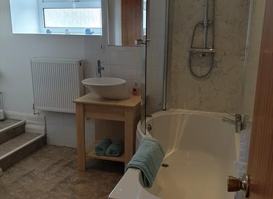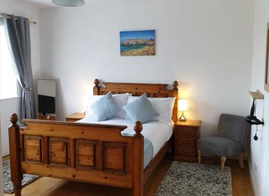 Upstairs there is a generous sized double bedroom with TV and views towards Snaefell and the hills. Also upstairs is the bathroom with an over the bath rainforest shower.