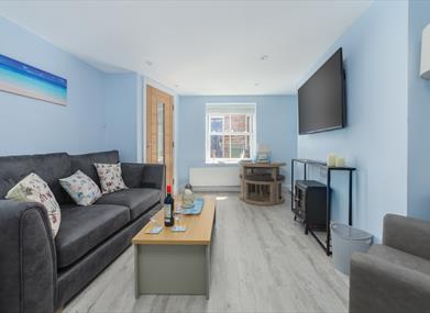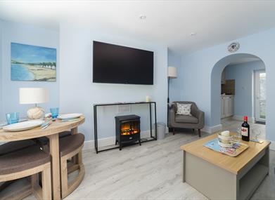 Lounge: Comfortable sofa and two chairs, dining room table and 4 chairs, large TV and electric 'log burning effect' fire.