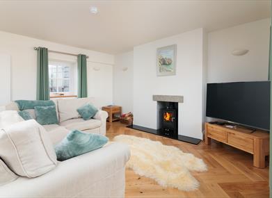 Lounge/Dining area: Large corner sofa, Dining table and 4 chairs, Apple TV, coffee table, log burner.