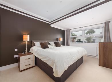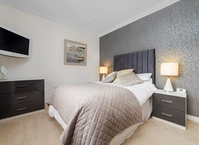 Bedroom 4: Double bed, bedside tables, chest of drawers, Smart TV, plentiful wardrobe space and large windows to enjoy the sea view!