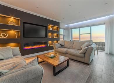 Lounge: Electric fire, three sofas, coffee table, Smart TV and a spectacular view.