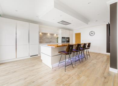 Kitchen/Dining area: Oven, combi microwave, boiling water tap, large integrated fridge / freezer, dishwasher, Smart TV, dining table & eight chairs and kitchen island featuring electric hob, breakfast bar and pop-up socket.