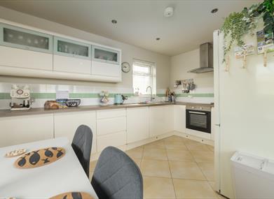 Kitchen/Dining area: Electric oven, electric hob, fridge, freezer, washing machine, dishwasher, microwave, dining table & four chairs