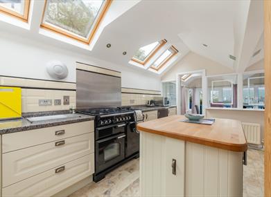 Kitchen: Electric oven, gas hob, fridge, freezer, dishwasher, microwave.