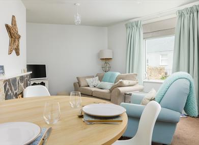 Lounge/Diner: Dining room table, 4 chairs, Sofa and a chair providing ample seating for 4 and large TV.