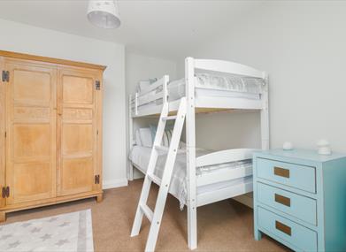 Bedroom 1: Twin beds, bedside cabinets, chest of drawers, wardrobe, Smart TV.