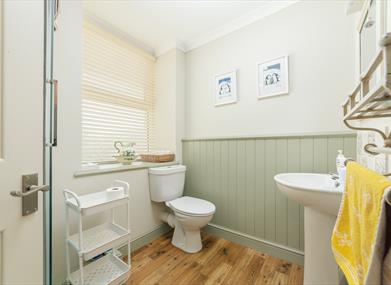 Bathroom: Shower, W/C, and sink, storage for toiletries