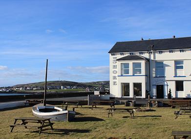 A stormy day in Gansey Bay is by its very nature a dramatic and wild event. Watching nature at its angriest from the sanctuary of the Shore, has to be one of life’s little pleasures – as you will discover when you visit us at the south of the Island. The main bar of the Shore has been transformed in the past year. If glitzy chrome and plastic are your thing then stay away, because The Shore has embraced its seaside location by introducing an eclectic, vintage chic/New England feel. Rich cream shades with the tasteful and abundant application of natural wood finishes make it a cosy, welcoming space. Table tops formed from heavy planks hewn from original Georgian beams, a driftwood effect feature wall and a quirky new bar, created from sections of panelled doors – some still bearing their original street numbers – all help create a wonderfully warm and relaxed ambience. One corner of the room is given over to comfy leather settees, here you can see a number of fascinating old sepia images of the building – taken at the height of a storm early in the last century. Running the full length of the bar area are chunky wooden ship’s rails. Their earlier life was, it seems, spent attached to a boat that made regular trips between Peel and Northern Ireland. The food served at The Shore, as you will discover, is exceptionally good. The regular menu offers quality and value with tasty treats such as Pan-fried King Prawns in a chilli and garlic butter sauce with crusty bread and from the mains list, Cod Mornay in a creamy sauce. Steak lovers might opt for the fabulous 8oz Ribeye Steak, with hand-cut chips, Mushrooms, Onion Rings and Tomato. Other eye-catching dishes include the Shore’s famous Chicken Curry. A daily specials board supplements the regular offerings, and there’s also bar snacks, tasty sandwiches and lite bites throughout the day.