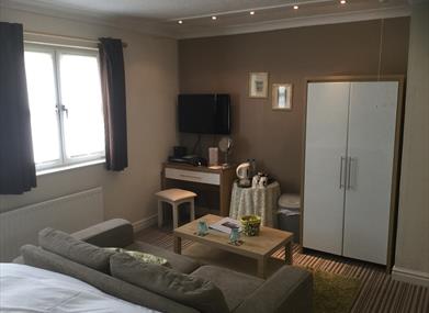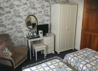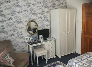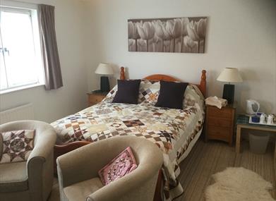Fendale offers four rooms in all. The main guest room is a large en-suite room looking south over the garden. It has a sitting area and the TV in this room has dedicated Sky top box. The double bed has a Tempur mattress to ensure a good night sleep. The second room, also en-suite, is of a similar size. The room is large enough to accomodate a single bed if required as a Family room. The third room is not en-suite but is let with a private bathroom facility. The fourth room is a single room but is large enough to accommodate two single beds. Ideal for children.